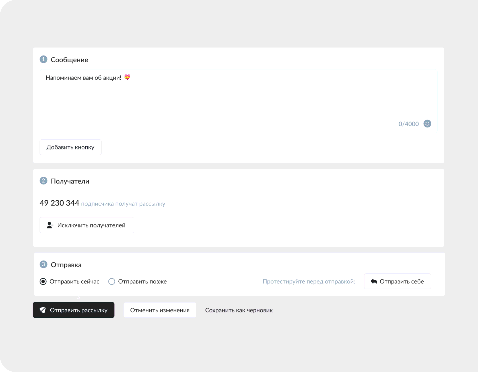 Делитесь новыми предложениями и важными новостями, экономя бюджет на маркетинг.